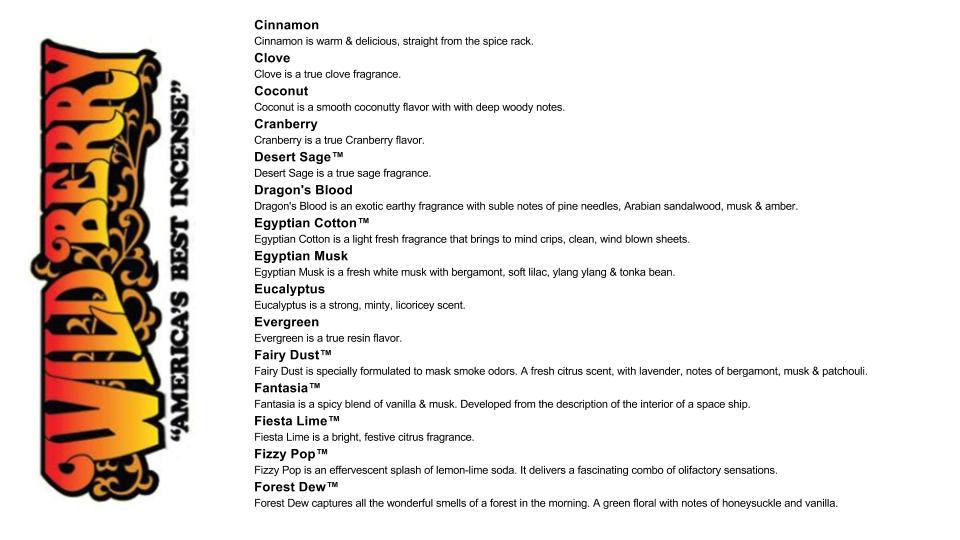Wild Berry was established circa 1971 in Oxford, Ohio. From humble beginnings, they've now spread their peace, love, and incense all over the world. With over 90 premium quality fragrances, not all colors or variations can be pictured. Many of the items we carry are of varying styles and/or colors. If you would like to request a specific style or scent please call us at (512) 216-6281 & we'll create a custom order for you.